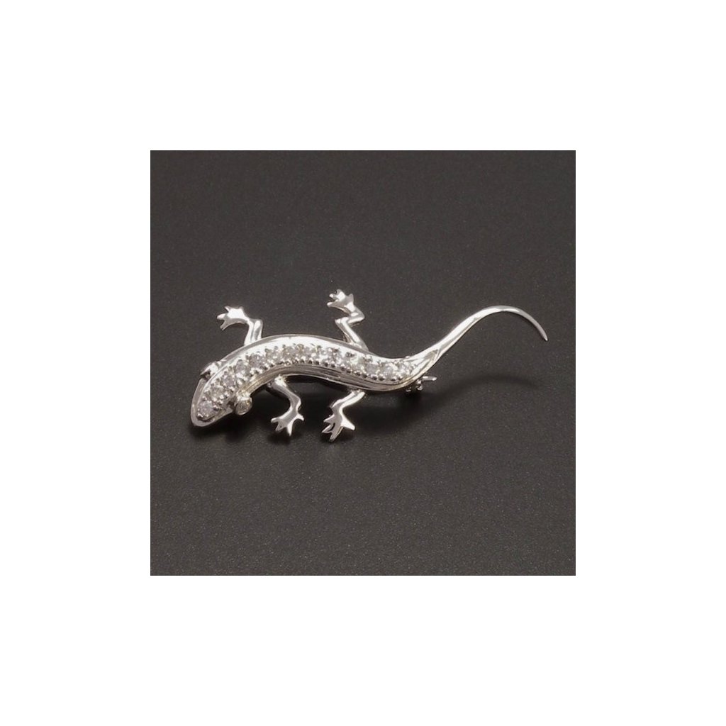 Stříbrná brož je vyrobena ze stříbra ryzosti 925/1000. Stříbrná brož ve tvaru ještěrky má jehlu s pojistkovým uzávěrem. Stříbrná ještěrka má v očích zasazeny dva bílé kamínky. Hřbet ještěrky zdobí řada bílých zirkonů. Zajímavý stříbrný doplněk pro mnoho příležitostí.
