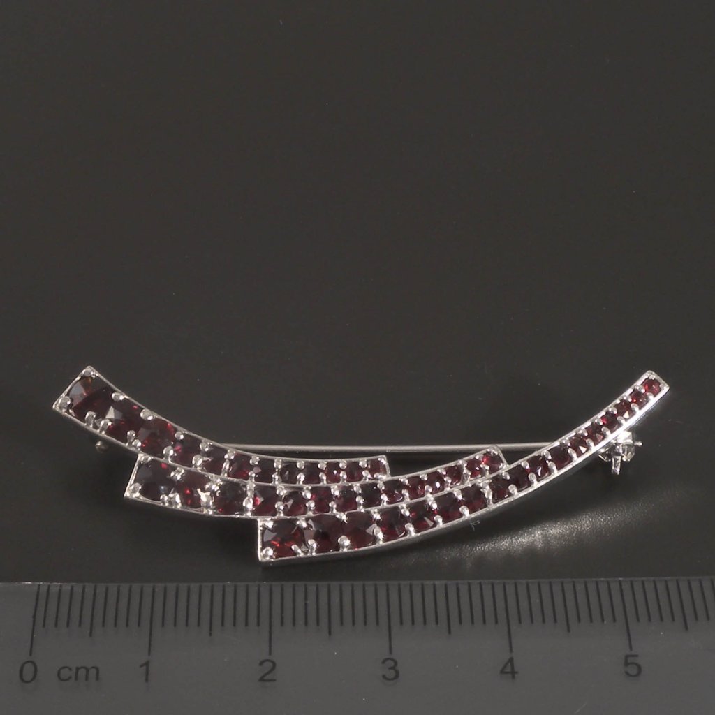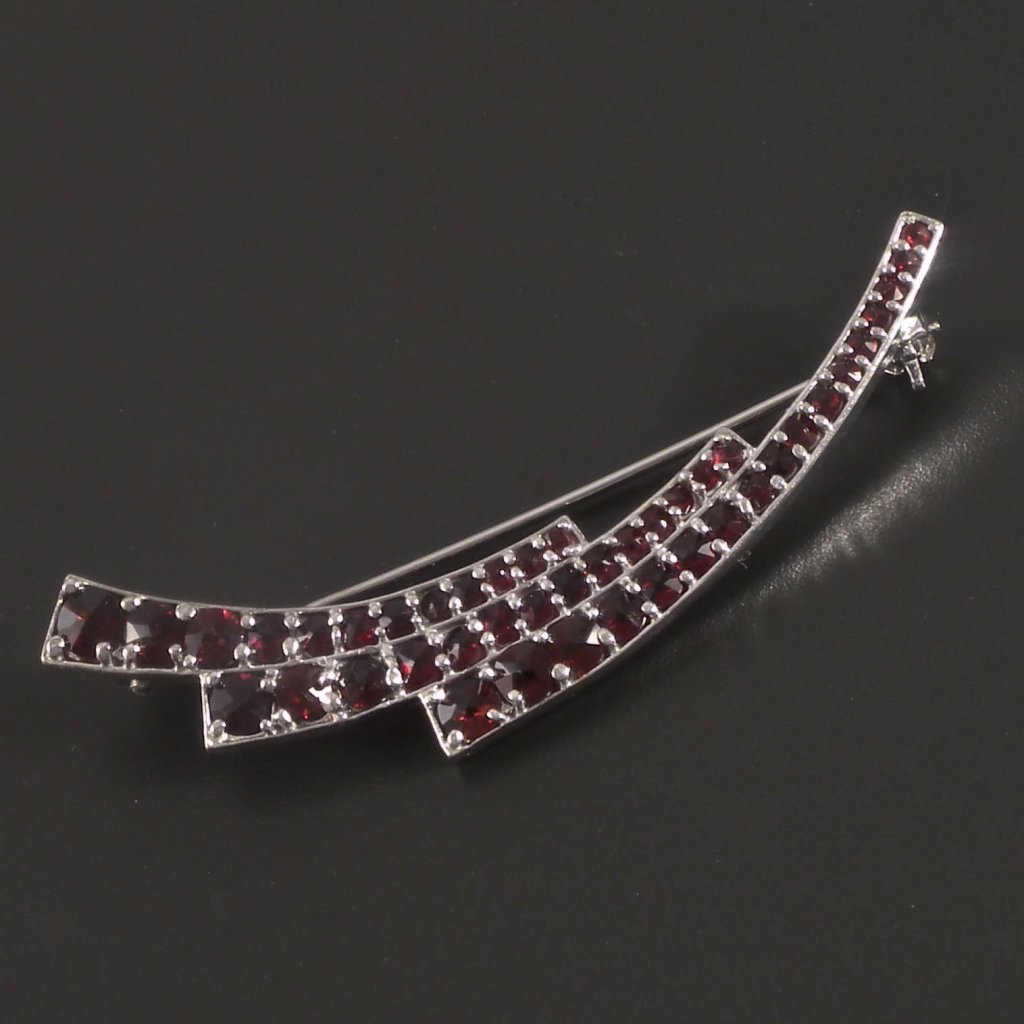 Stříbrná brož s granáty představuje spojení elegance, tradice a jemného detailu. Obloukový tvar zvýrazňuje precizní řazení granátů, které vynikají charakteristickou tmavě červenou barvou. Každý kámen je zasazen ručně, což zaručuje vysokou kvalitu a dokonalý třpyt při každém pohybu. Brož je vyrobena ze stříbra s lesklou povrchovou úpravou, která podtrhuje lesk granátů a dodává šperku luxusní vzhled. Krásný doplněk pro ženy, které si potrpí na eleganci s českým rukopisem.
