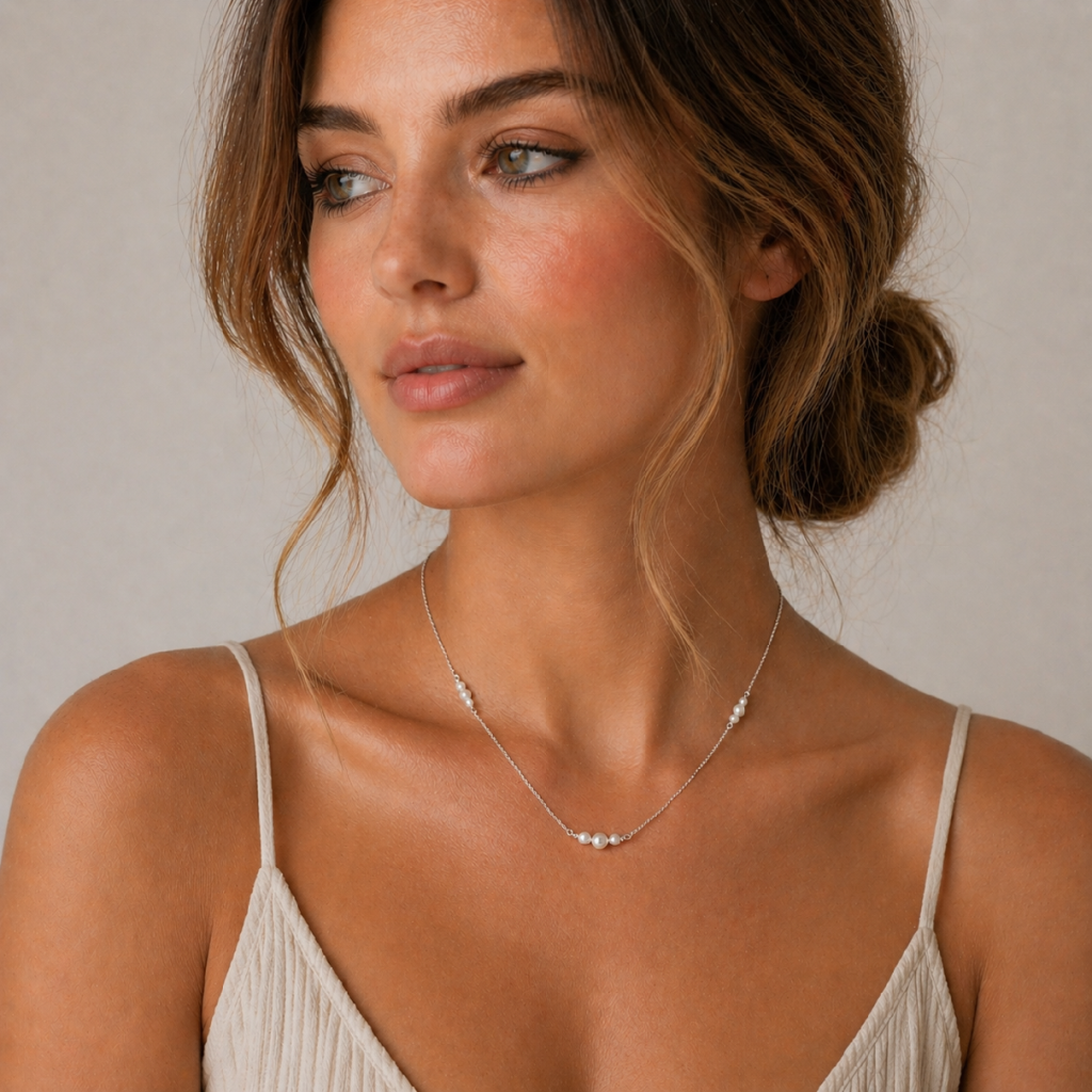 Tento jemný náhrdelník z bílého zlata je zdobený drobnými kultivovanými perlami, které dodávají šperk v nadčasovou eleganci. Bílé zlato spolu s perlami vytváří harmonický kontrast, díky němuž působí náhrdelník velmi sofistikovaně a stylově. Tento šperk je ideální volbou jak pro každodenní nošení, tak i pro speciální příležitosti.