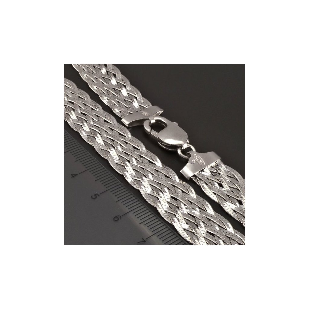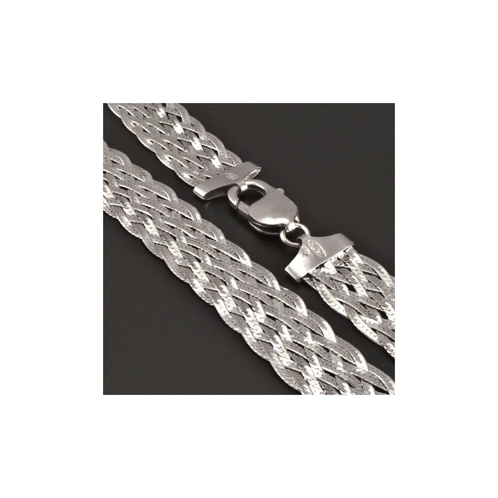 Stříbrný náhrdelník je vyroben ze stříbra ryzosti 925/1000. Široký stříbrný náhrdelník je pleten z několika drobných plochých řetízků. Tento náhrdelník je v kombinaci lesklého a vybrušovaného provedení, což dodává na třpytu celému náhrdelníku. Šířka náhrdelníku je 14 mm. Stříbrný náhrdelník má karabinový uzávěr. Náhrdelník je možné zkombinovat s náramkem viz zboží související.