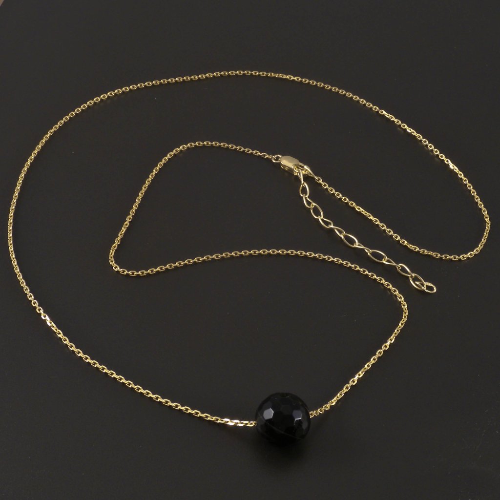 Tento náhrdelník ze žlutého zlata poutá pozornost broušeným onyxem, jehož temná barva vytváří harmonický kontrast s lesklým kovem a dodává šperku osobitý charakter. Kámen je zasazen tak, aby vynikl jeho povrch a tvar, díky čemuž působí přívěsek velmi elegantně a čistě. Náhrdelník je vhodný pro každodenní nošení i speciální příležitosti, protože se díky svému univerzálnímu tvaru dobře kombinuje s ostatními šperky a dodává celému vzhledu moderní a vyvážený výraz. Je to šperk určený ženám, které ocení eleganci, jednoduchost a výrazný detail v jednom.