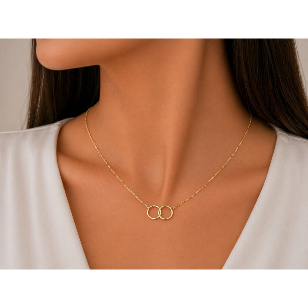 Zlatý náhrdelník tvoří dva decentně propojené kroužky, které evokují propojení dvou duší, přátelství nebo blízkost partnerů. Náhrdelník je vyroben ze žlutého zlata a díky svému nadčasovému vzhledu se stává ideálním doplňkem pro každou příležitost – od běžného dne až po slavnostní okamžiky. Minimalistické provedení z něj dělá šperk, který dokonale doplní jakýkoliv outfit, aniž by ho přehlušil.