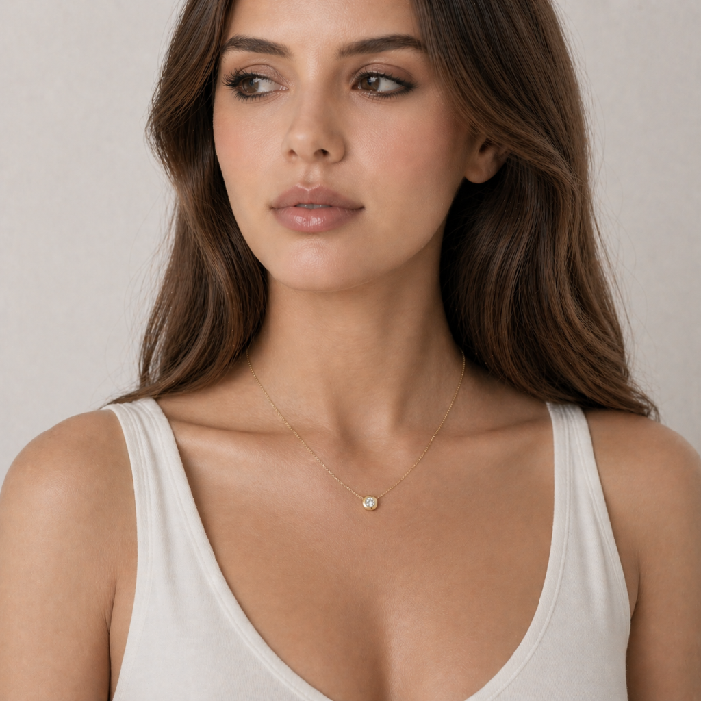 Zlatý náhrdelník s drobným zirkonem ve středu působí velmi decentně a vkusně. Kámen je vsazen do hladkého kulatého lůžka a volně se pohybuje po řetízku, čímž šperk získává živý nádech. Díky jemnému zpracování se náhrdelník hodí jak k dennímu outfitu, tak i k elegantním příležitostem. Žluté zlato v kombinaci s čirým kamenem vytváří klasický, ale stále moderní doplněk. Délku lze upravit díky prodlužovacímu řetízku.