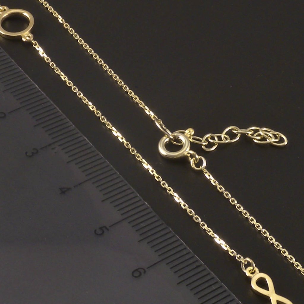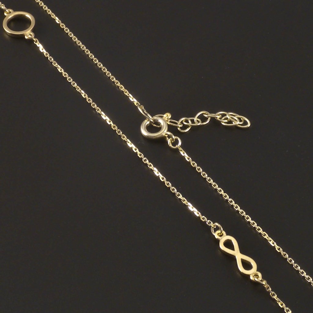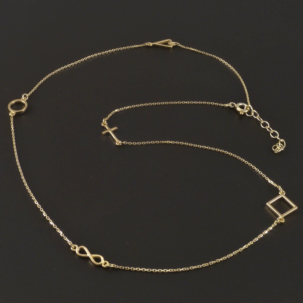 Tento elegantní náhrdelník ze zlata představuje spojení pěti základních symbolů – kříže, trojúhelníku, čtverce, kruhu a nekonečna. Každý z nich má svůj význam a společně vytvářejí harmonický celek, který působí duchovně i moderně. Šperk je vyroben ze zlata ryzosti 14kt. 585/1000 a má jemný lesklý řetízek s detailním zpracováním přívěsků. Díky prodlužovací části si můžete délku přizpůsobit podle outfitu. Tento náhrdelník vynikne samostatně i v kombinaci s dalšími zlatými šperky.
