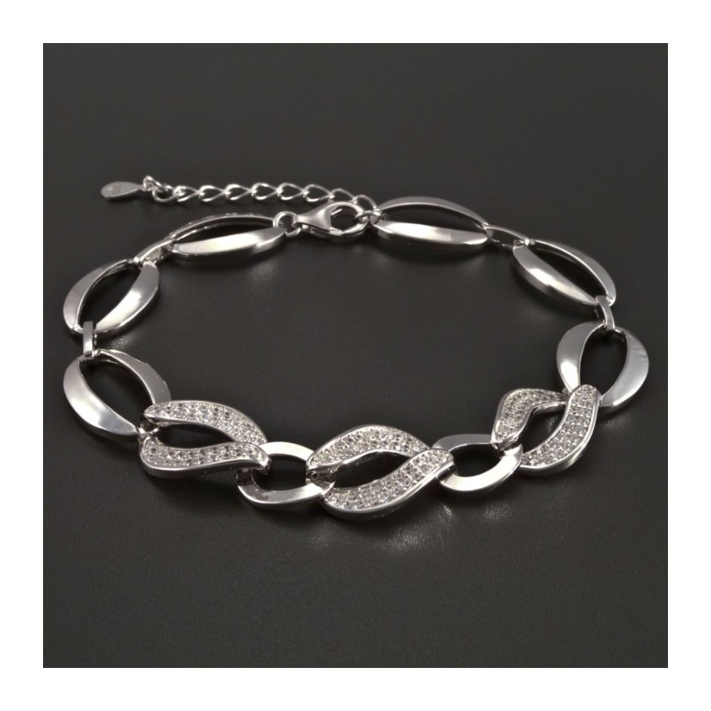 Stříbrný náramek je vyroben ze stříbra ryzosti 925/1000. Tento náramek tvoří různě veliké články kdy nejširší měří 11 mm. Náramek je v hladkém lesklém provedení a tři prostřední články jsou osazeny jemnými bílými zirkony. Stříbrný náramek má prodlužovací řetízek, proto je variabilní délka náramku 18-21 cm. Náramek má karabinový uzávěr a je povrchově upraven rhodiem. Doporučujeme.