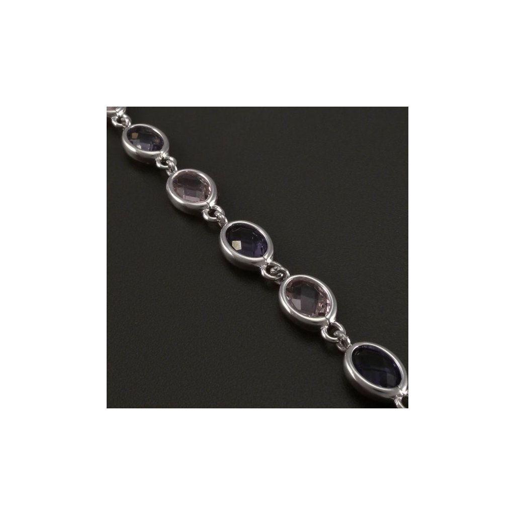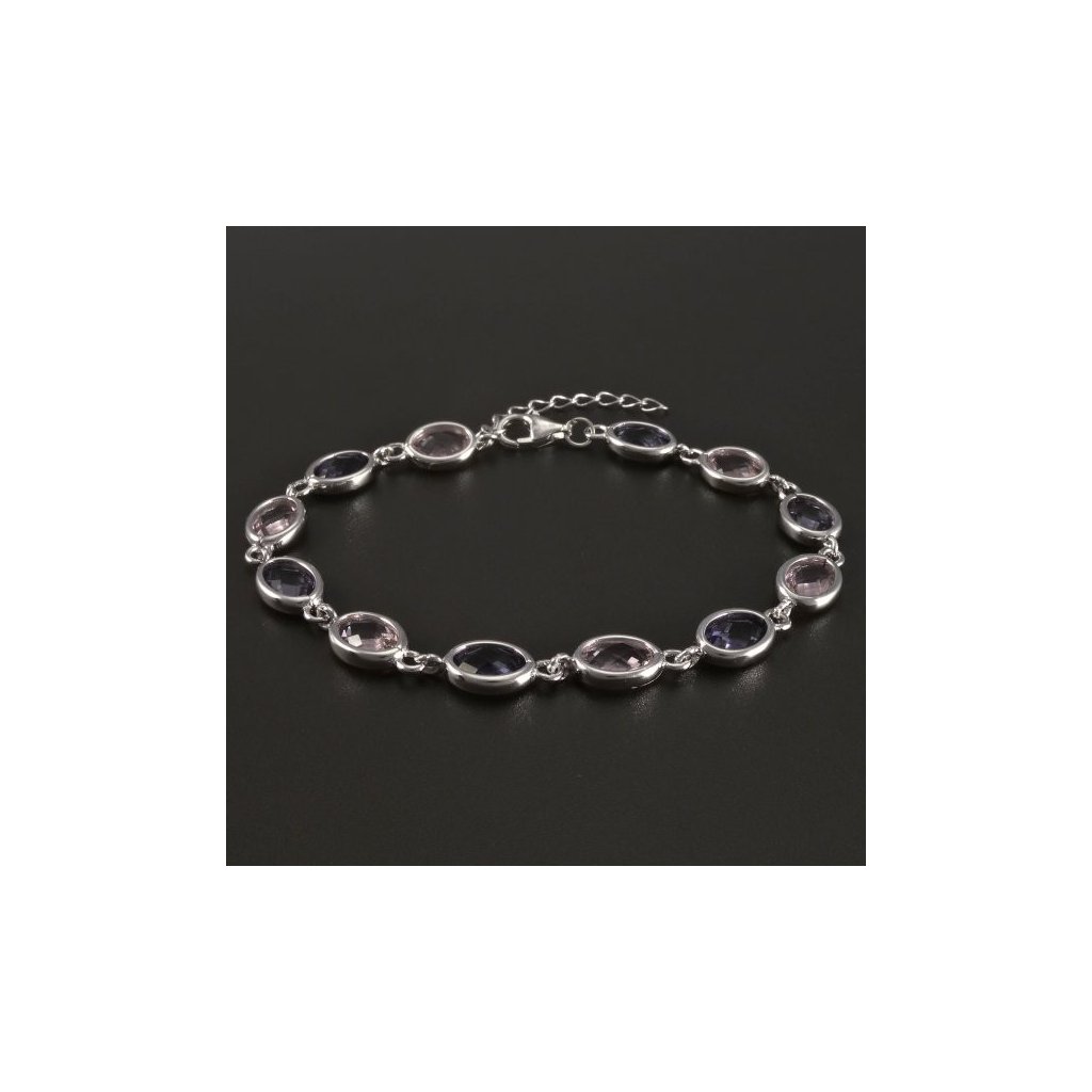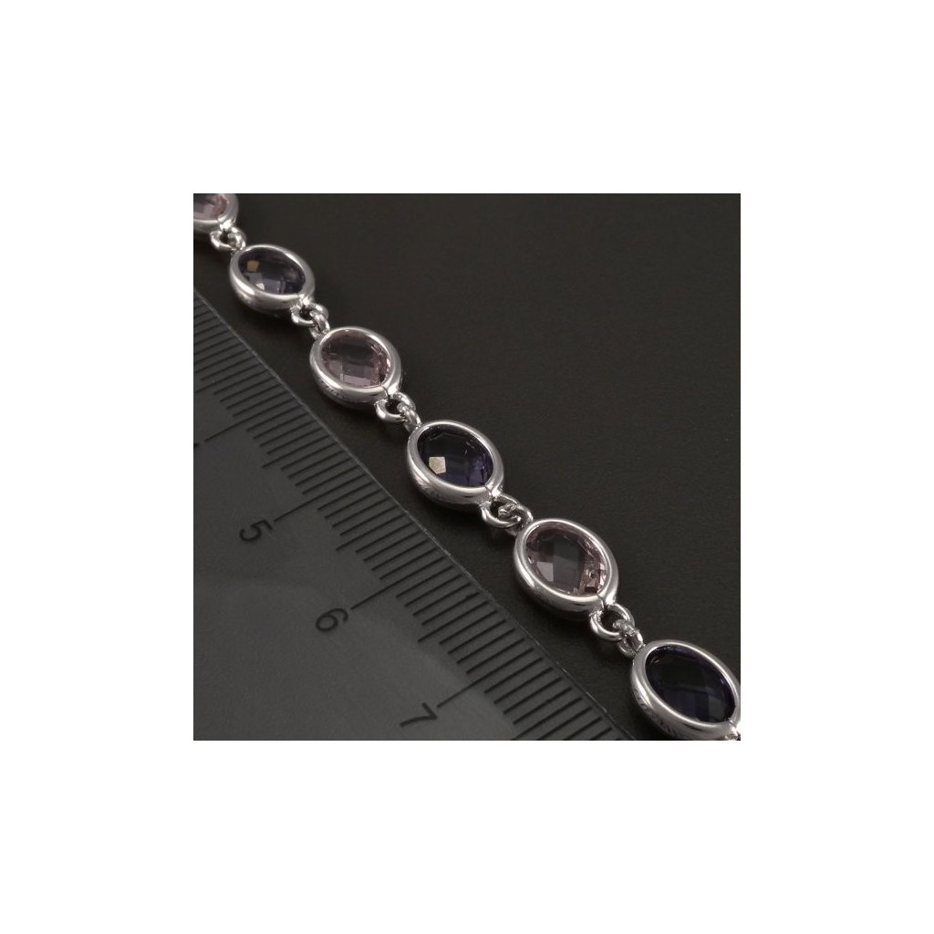 Náramek je vyroben ze stříbra ryzosti 925/1000. Stříbrný článkový náramek je osazen fialovými a růžovými oválnými zirkony s krásným brusem. Velikost zirkonů je 7x5 mm. Náramek je opatřen prodlužovacím řetízkem s variabilní délkou a má zapínání na karabinu. Tento stříbrný šperk je povrchově upraven rhodiem. Krásný stříbrný náramek vhodný pro mnoho příležitostí.