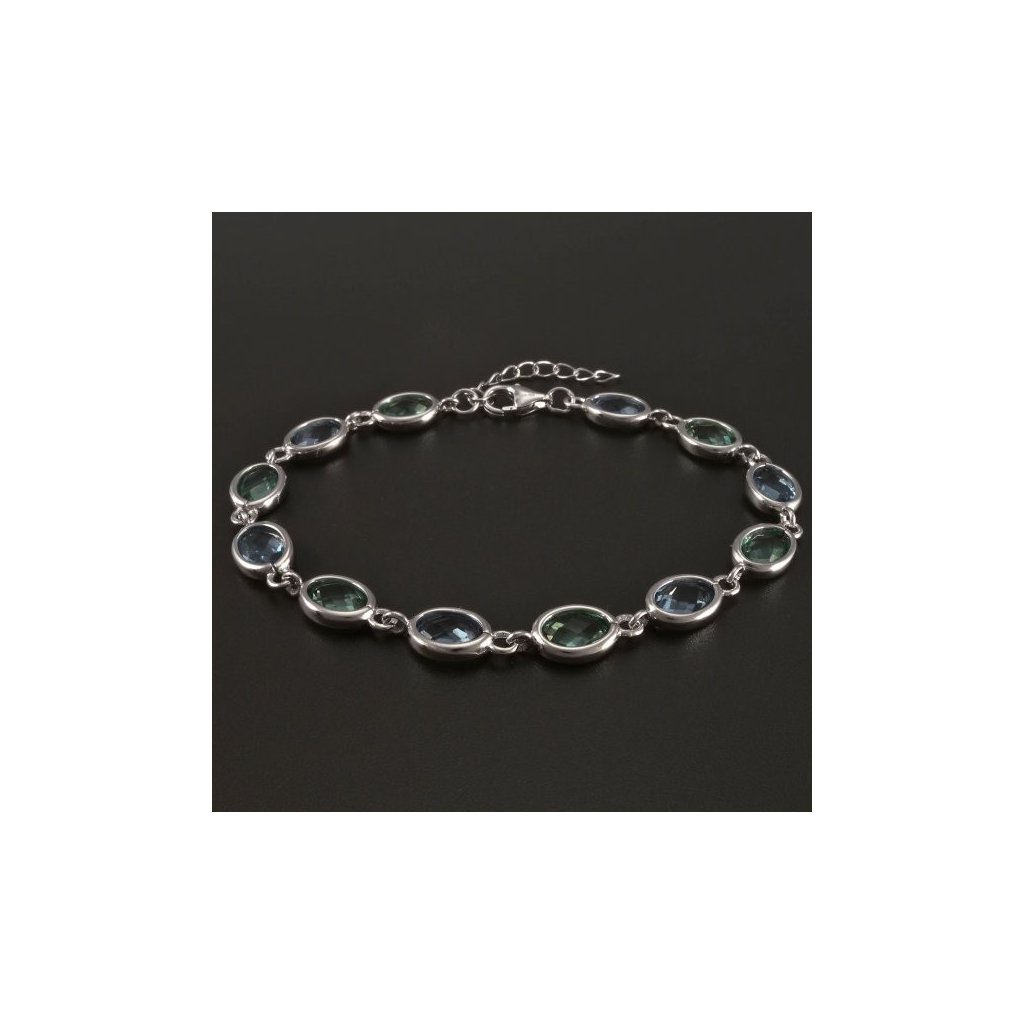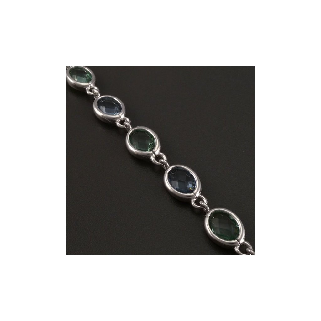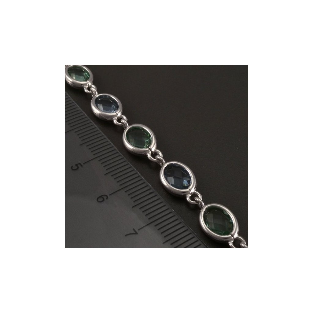 Náramek je vyroben ze stříbra ryzosti 925/1000. Článkový stříbrný náramek je osazen světle modrými a zelenými oválnými zirkony s krásným brusem. Velikost kamenů je 7x5 mm. Náramek je opatřen prodlužovacím řetízkem s variabilní délkou a má karabinové zapínání. Tento stříbrný šperk je povrchově upraven rhodiem. Krásný stříbrný doplněk vhodný pro každý den.