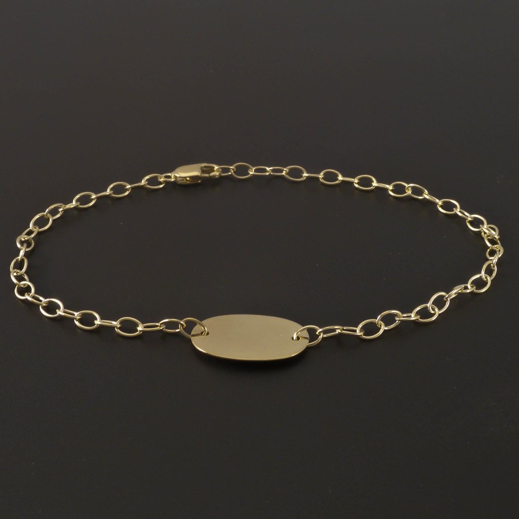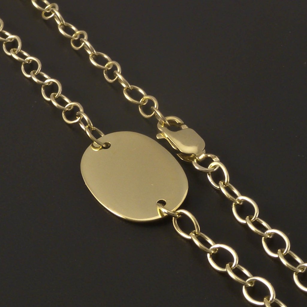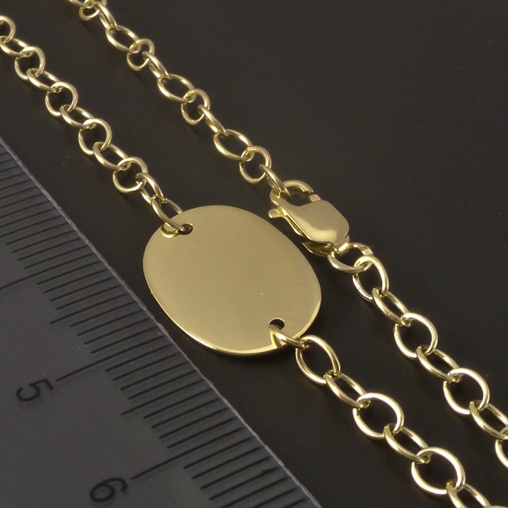 Tento náramek s oválnou destičkou ze žlutého zlata spojuje eleganci s osobním významem. Je zhotoven ze zlata ryzosti 14kt. 585/1000 a má jemnou řetízkovou vazbu, která působí vzdušně a lehce. Lesklá destička je ideální pro gravírování jména, data nebo symbolu s osobním poselstvím. Díky univerzálnímu vzhledu se skvěle hodí ke každodennímu outfitu i slavnostním příležitostem. Lesklý povrch zvýrazňuje přirozený lesk zlata, který nikdy nevyjde z módy.