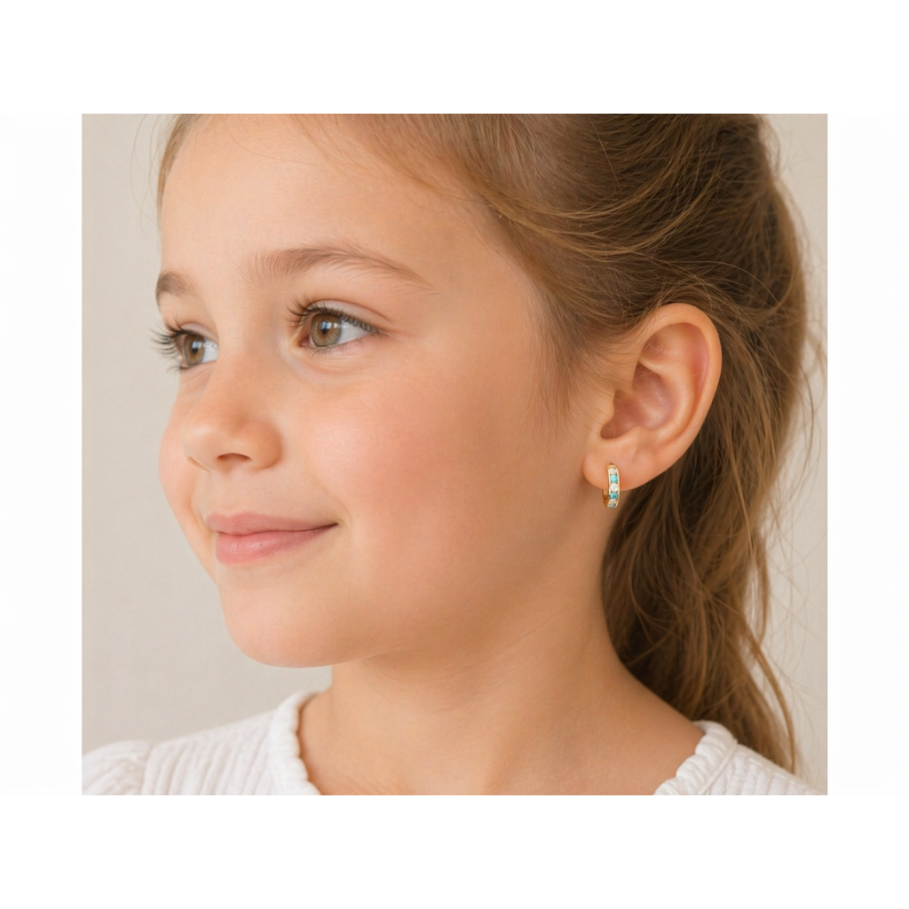 Tyto krásné zlaté dětské náušnice ve tvaru kroužků jsou ideální volbou pro malé slečny, které milují barevné šperky. Jemně broušené zirkony v tyrkysové a bílé barvě nádherně vynikají v kombinaci se žlutým zlatem, které dodává náušnicím nadčasovou krásu. Zacvakávací zapínání zajišťuje pohodlné a bezpečné nošení, což je ideální pro dětské uši. Perfektní volba jako první náušnice nebo dárek k významné události.