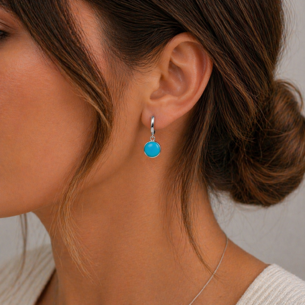 Náušnice jsou vyrobeny ze stříbra ryzosti 925/1000. Kulaté visací náušnice jsou v hladkém lesklém provedení a jsou povrchově upraveny rhodiem. Náušnice jsou osazeny přírodními tyrkysy o průměru 10 mm. Stříbrné lesklé náušnice mají zacvakávací pojistkový uzávěr. Moderní náušnice ze stříbra pro mnoho příležitostí.