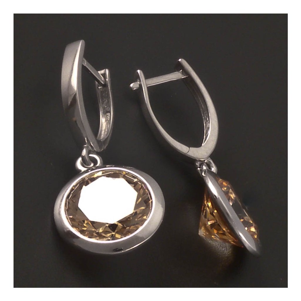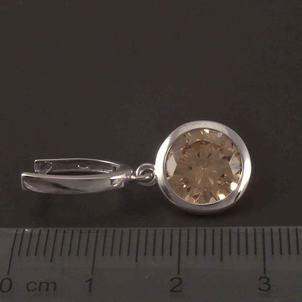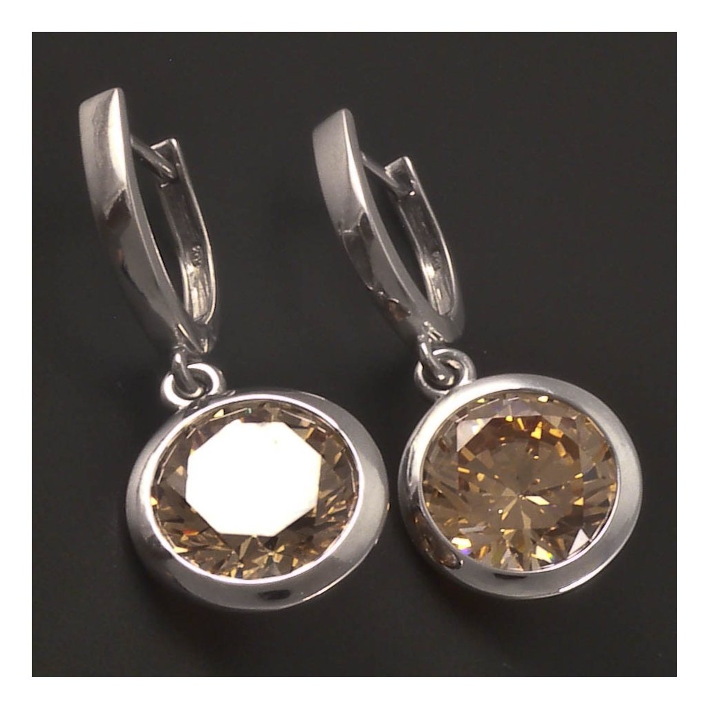Visací stříbrné náušnice se zirkonem barvy champagne o průměru 10 mm vynikají svou barevností a zářivým leskem. Kámen je pevně zasazen v hladké obrubě, která podtrhuje jeho krásu a poskytuje mu optimální ochranu. Povrch náušnic je ošetřen rhodiem, díky čemuž si uchovává jas a odolnost proti zčernání. Pojistkové zacvakávací zapínání přináší komfortní a bezpečné nošení. Náušnice se skvěle hodí i pro každodenní nošení.