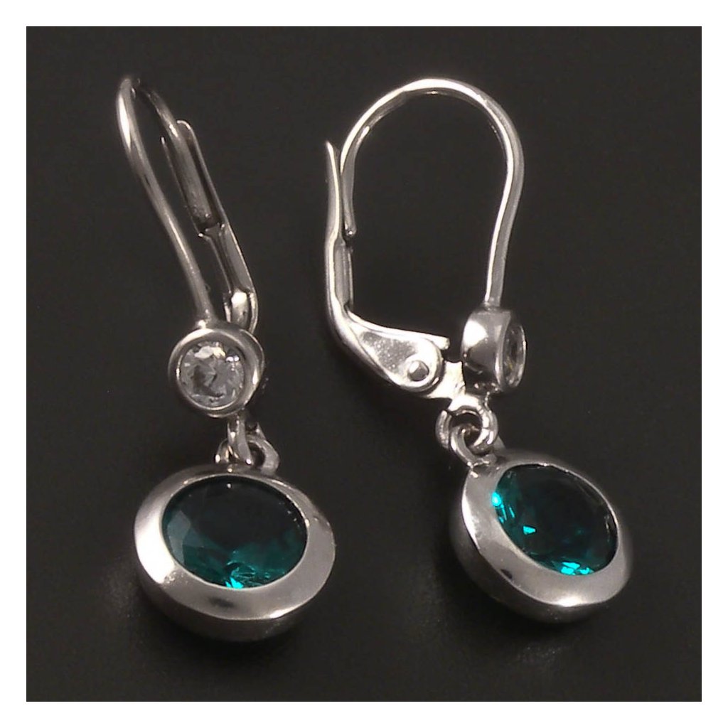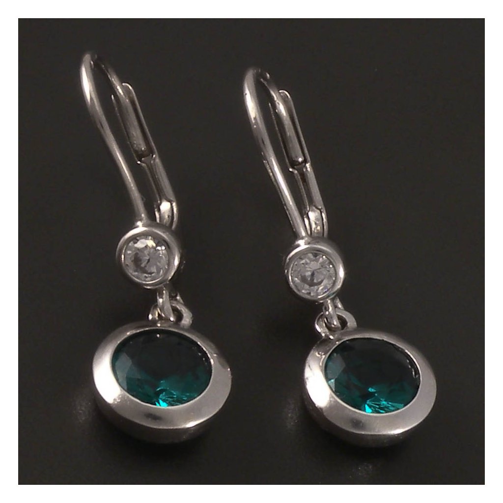 Náušnice z bílého zlata s visací ozdobou tvoří syntetické zelené smaragdy a třpytivé drobnější zirkony. Menší kámen je pevně vsazený v horní části u a větší kámen volně visí pod ním a při nošení se jemně pohybuje. Náušnice jsou v lesklém hladkém provedení. Náušnice jsou příjemné na nošení a vhodné jak do práce, tak i pro slavnostní chvíle.