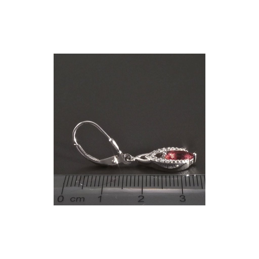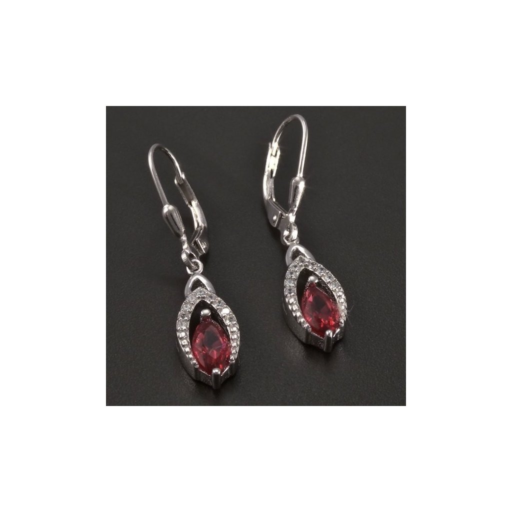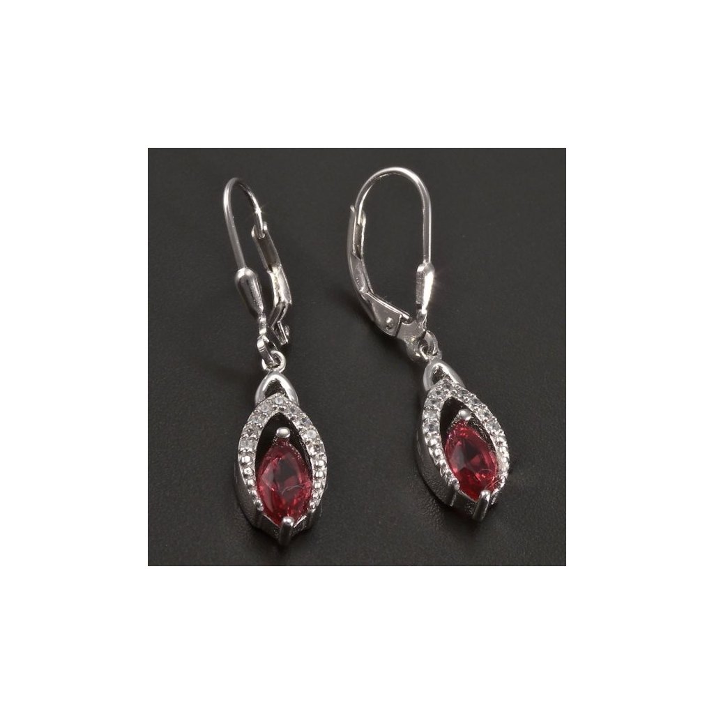 Náušnice jsou vyrobeny ze stříbra ryzosti 925/1000. Stříbrné visací náušnice v hladkém lesklém provedení jsou povrchově upraveny rhodiem. Stříbrné náušnice jsou osazeny červeným synt. rubínem a dozdobeny drobnými bílými zirkony. Náušnice mají klasické dámské zapínání a jsou 34 mm dlouhé. Krásné náušnice pro mnoho příležitostí.