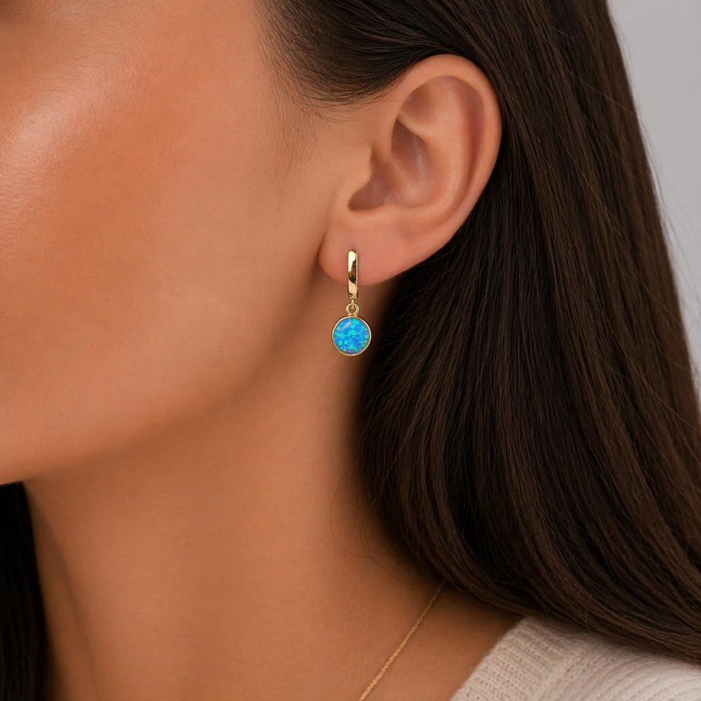 Elegantní náušnice ze žlutého zlata zdobí kulaté syntetické modré opály s typickým duhovým leskem, který mění tóny podle světla. Díky hladkému zasazení v lesklé zlaté obrubě působí šperk čistě, elegantně a moderně. Zacvakávací zapínání zajišťuje bezpečné a pohodlné nošení, ideální i pro běžný den. Opál vnáší do šperku barvu, lehkost a hravost – ideální volba pro ženy, které chtějí jemný, ale výjimečný kousek.