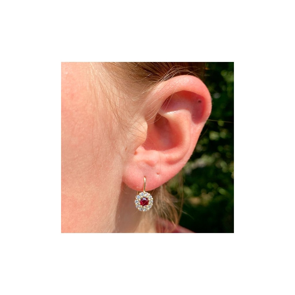 Elegantní náušnice z kvalitního žlutého zlata přitahují pozornost zářivým rubínem, jehož ohnivě červený odstín je zvýrazněn třpytem bílých zirkonů. Celkový design působí slavnostně, přesto zůstává decentní a vhodný pro každodenní nošení. Patentové zapínání zajistí spolehlivou fixaci a pohodlí. Tento šperk je skvělou volbou pro ženy, které chtějí doplněk, jenž podtrhne jejich osobnost a styl.