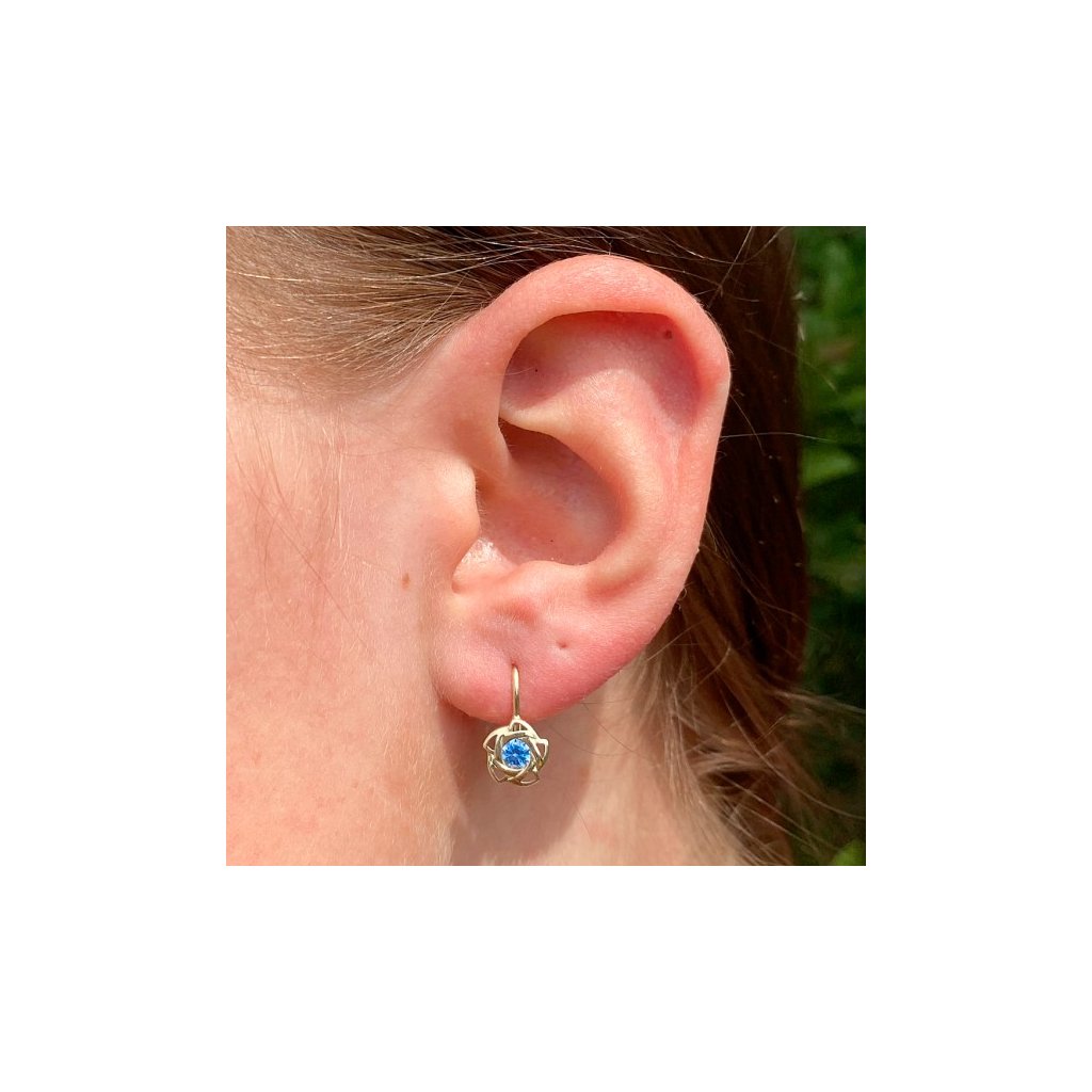 Elegantní náušnice ze žlutého zlata vynikají jemným provedením s motivem kytičky, do které je vsazen světle modrý akvamarín kulatého brusu. Díky lesklému povrchu zlata a třpytu kamene působí náušnice jemně, ale zároveň dostatečně výrazně, aby přitáhly pozornost. Patentové zapínání zajistí pohodlné a bezpečné nošení. Jsou ideální pro ženy i dívky, které hledají šperk, jenž se hodí jak k dennímu outfitu, tak k elegantním příležitostem.