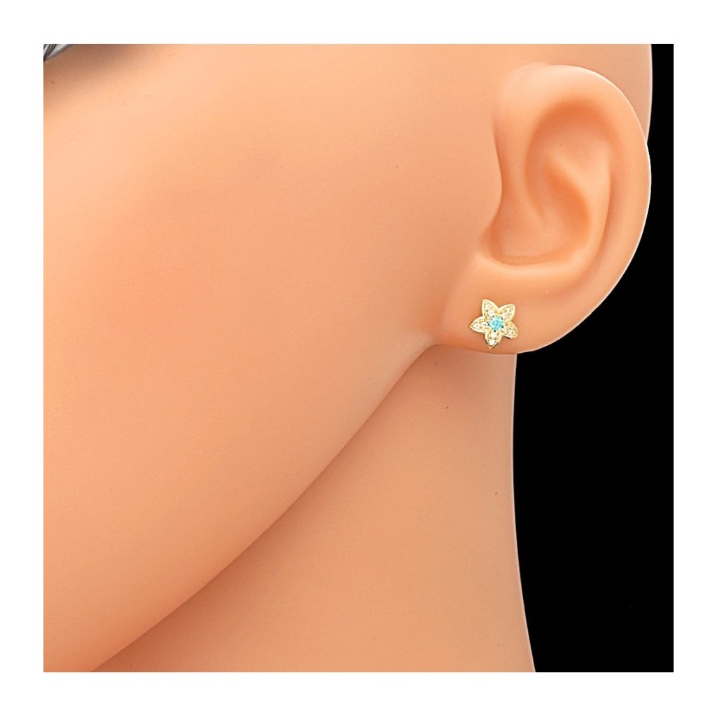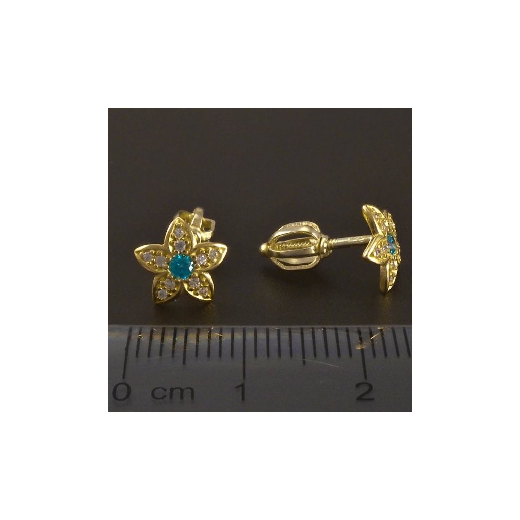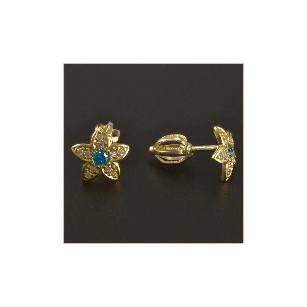 Náušnice jsou vyrobeny ze žutého zlata ryzosti 14 kt. 585/1000. Krásné zlaté náušnice ve tvaru kytičky jsou v lesklém hladkém provedení a mají šroubkový uzávěr. Zlaté náušnice jsou osazeny tyrkysovým zirkonem o průměru 2 mm, a jsou dozdobeny jemnými bílými zirkony. Slušivé náušnice vhodné pro každý den.