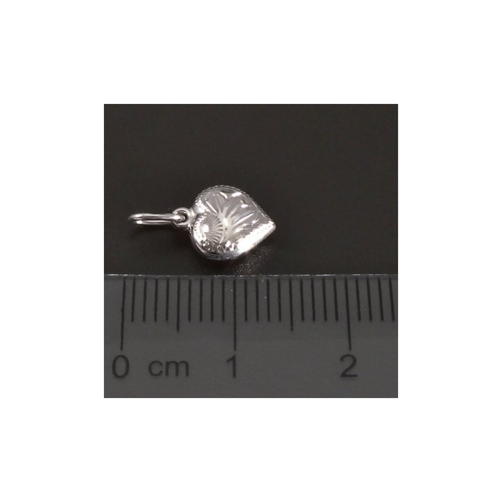 Přívěsek je vyroben z kvalitního bílého zlata ryzosti 14-kt. 585/1000. Drobný přívěsek je ve tvaru srdce a je opatřeno ouškem na provléknutí jemného řetízku. Celkový rozměr přívěsku je 14x8 mm. Přední strana srdíčka je zdobena rytinou a zadní strana je v lesklém hladkém provedení. Decentní šperk z bílého zlata je vhodný pro každý den.