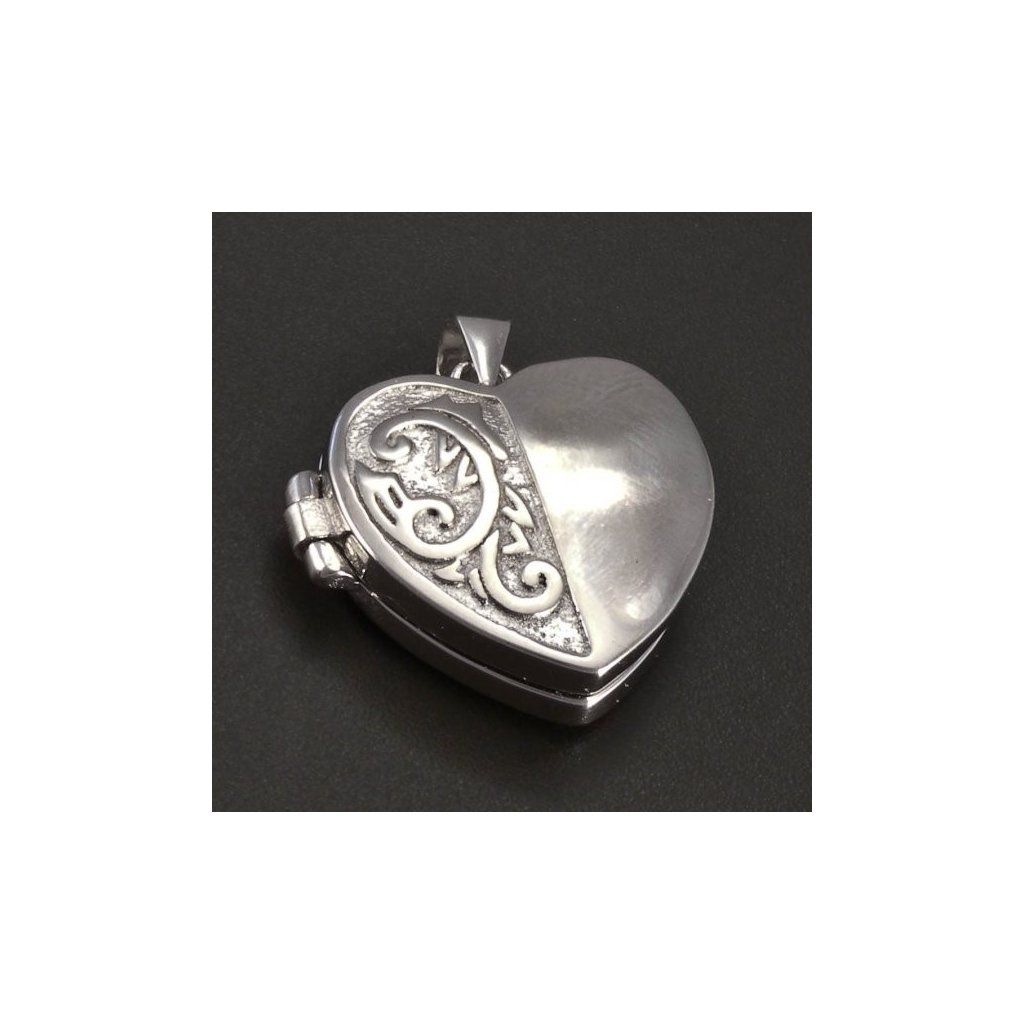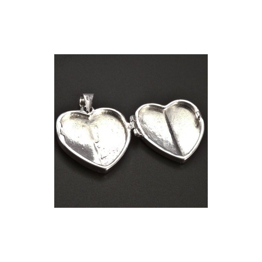 Stříbrný přívěšek je vyroben ze stříbra ryzosti 925/1000. Stříbrný přívěšek medailon ve tvaru srdce. Obě strany přívěsku jsou v kombinaci lesklého a matného provedení a jsou zdobeny krásnou rytinou. Stříbrný medailon je otevírací a je určen pro vložení dvou fotografií. Velikost stříbrného medailonu je 25 x 18 mm. Stříbrný přívěsek má povrchovou úpravu rhodiem. Doporučujeme