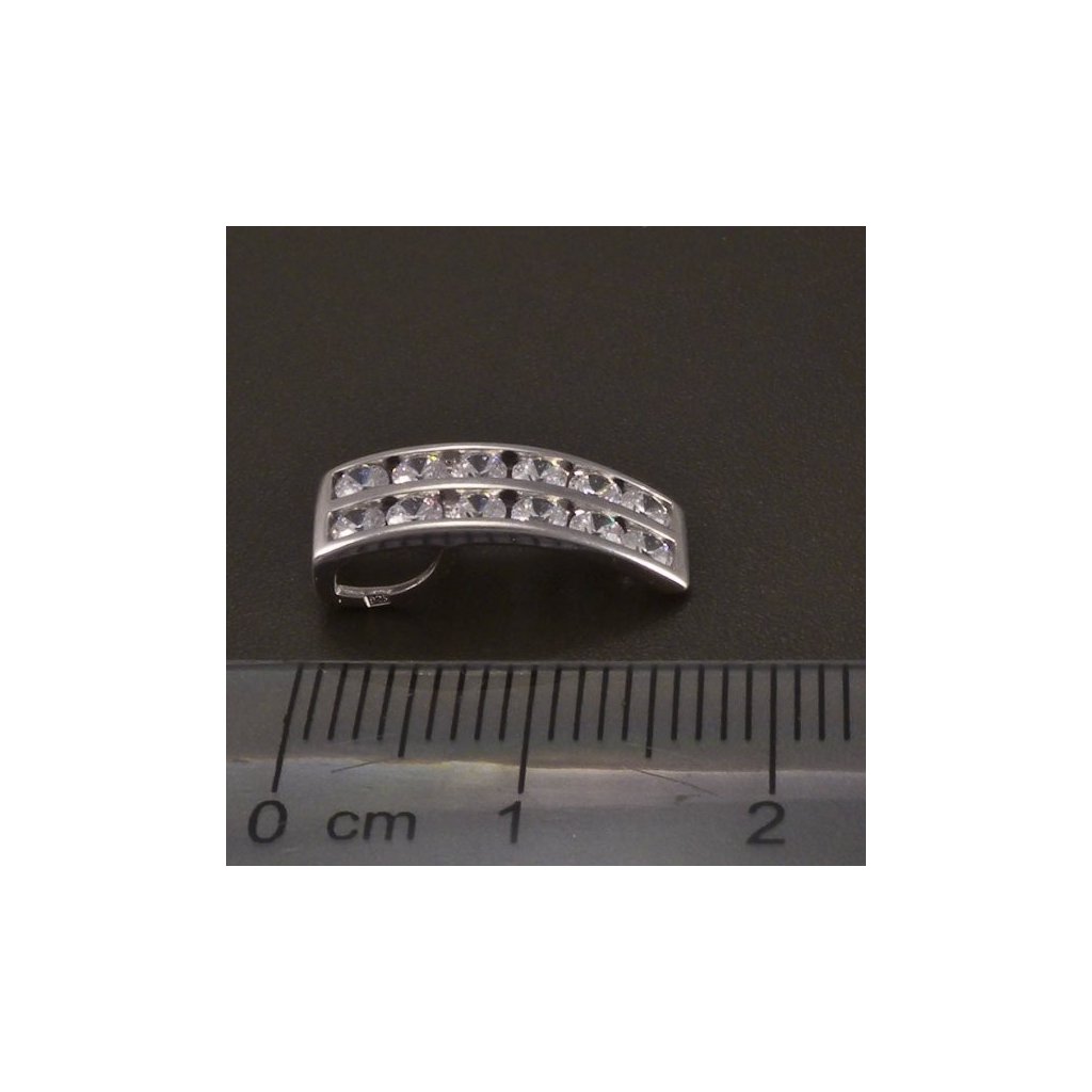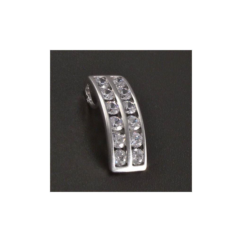 Přívěsek je vyroben z kvalitního stříbra ryzosti 925/1000. Stříbrný přívěs obdélníkového tvaru je v hladkém lesklém provedení a je osazen bílými zirkony ve dvou řadách. Průměr kulatého kamene je 2 mm. Ouško na provlečení řetízku je umístěno na zadní straně stříbrného přívěsku. Šperk je povrchově upraven rhodiem. Elegantní přívěsek vhodný pro mnoho příležitostí.