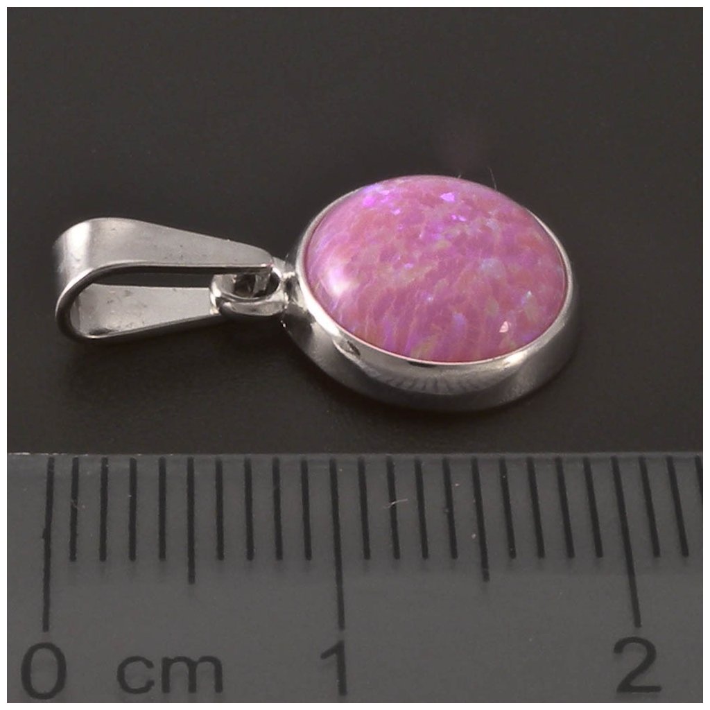 Tento kulatý přívěsek z rhodiovaného stříbra osazený syntetickým růžovým opálem působí jemně a elegantně. Barevná struktura kamene s odlesky dodává šperku originalitu a hravost. Hladké zasazení zvyšuje odolnost a umožňuje snadnou kombinaci s jinými šperky. Perfektní k jemnému i lehce silnějšímu řetízku a náušnicím stejného provedení.