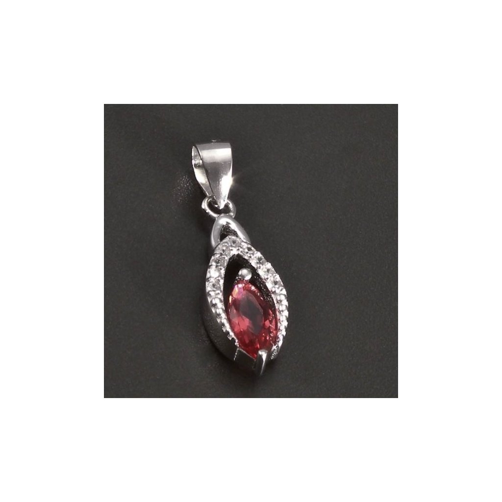 Přívěsek je vyroben ze stříbra ryzosti 925/1000. Stříbrný přívěsek v hladkém lesklém provedení je osazen červeným synt. rubínem spolu s drobnými zirkony a je povrchově upraven rhodiem. Krásný přívěsek vhodný pro mnoho příležitostí.