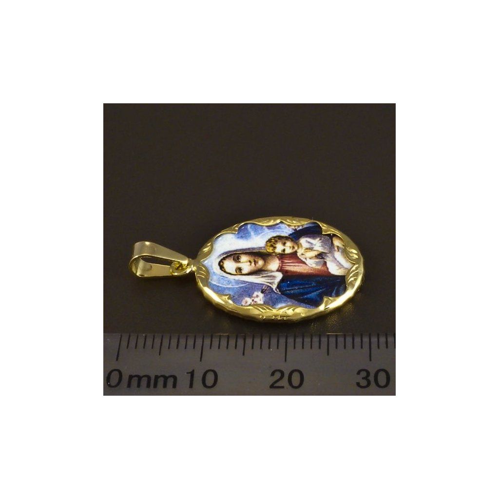Zlatý přívěsek Madona je vyroben ze zlata ryzosti 14 karátů 585/1000. Zlatá madonka je v provedení lesklé žluté zlato. Zlatý přívěsek oválného tvaru zdobí jemná ruční rytina. Z jedné strany je vyobrazena panna Marie s malým Ježíškem, ze strany druhé je latinský nápis. Velikost zlatého přívěsku je 31x18 mm. Krásná ruční práce.