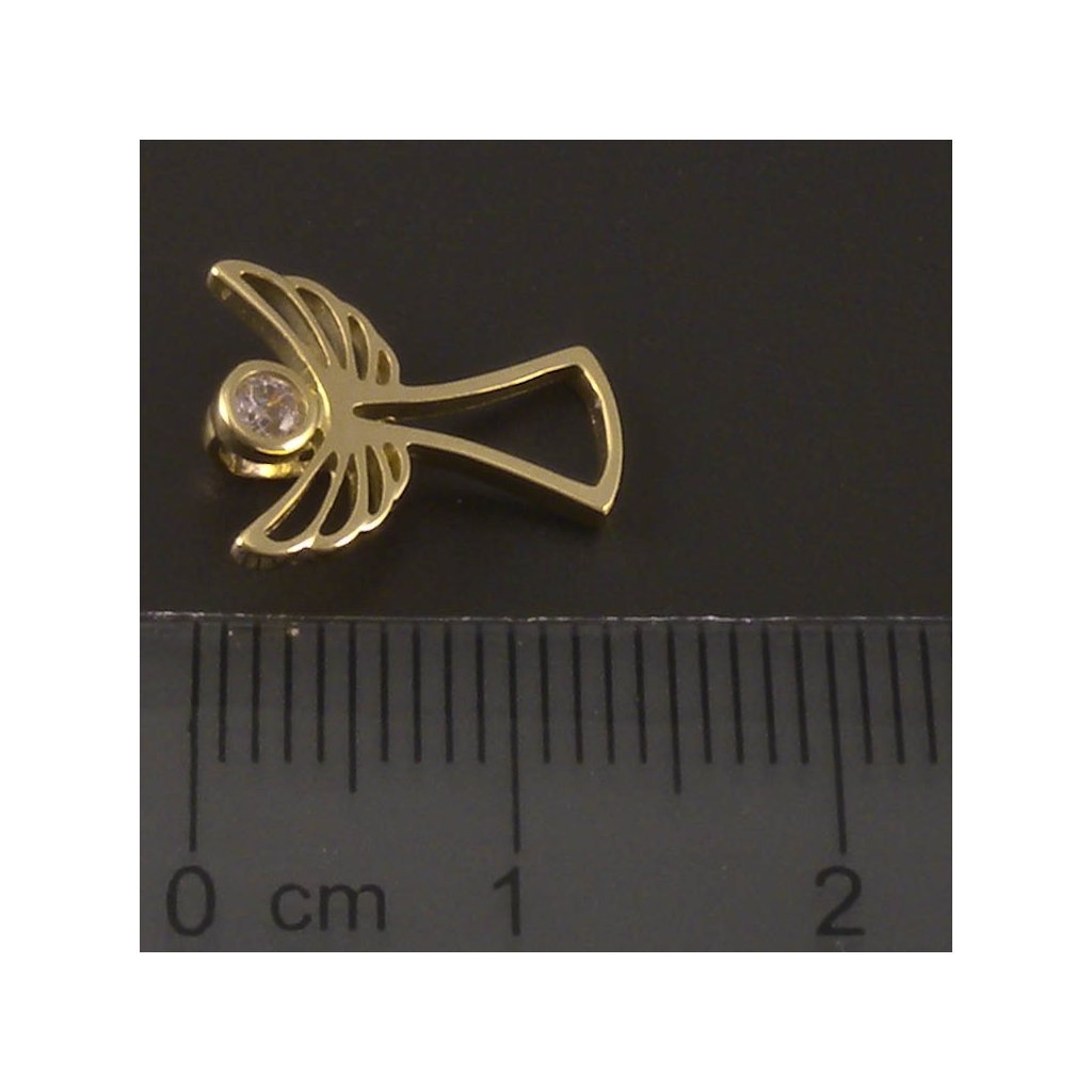Tento zlatý přívěsek ve tvaru anděla kombinuje jemné prořezávané linie s lehkým, vzdušným vzhledem, díky čemuž působí velmi harmonicky a přirozeně. Růžový zirkon umístěný v horní části přidává šperku jemný barevný detail, který přívěsek ozvlášťňuje, aniž by narušil jeho elegantní charakter. Díky minimalistickému tvaru a hladké lesklé úpravě se anděl snadno nosí na každodenní bázi a stává se příjemným osobním talismanem. Hodí se pro ženy všech věkových kategorií a představuje ideální dárek s osobním významem.