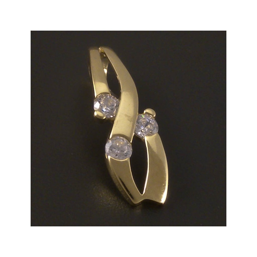 Tento elegantní přívěsek ze žlutého zlata zdobený třemi čirými zirkony nabízí moderní a velmi jemný vzhled, který krásně doplní jakýkoli zlatý řetízek. Propletený tvar dodává šperku vizuální lehkost, zatímco zadní ouško zajišťuje stabilní polohu přívěsku při nošení. Lesklé provedení zvýrazňuje třpyt kamenů, takže šperk působí efektně, ale stále decentně. Je ideální pro ženy, které vyhledávají drobné, elegantní a dobře kombinovatelné doplňky.