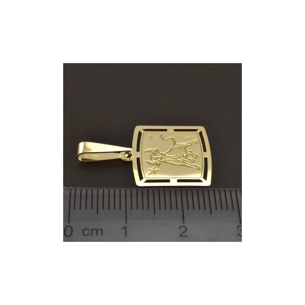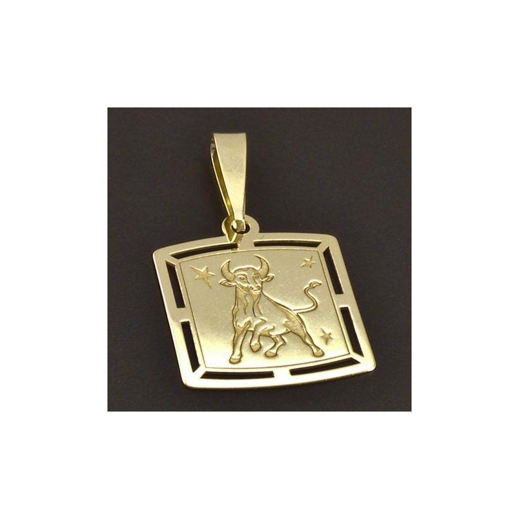 Zlatý přívěsek měsíční znamení býka 22.4. - 21.5. Tento přívěsek je vyroben ze žlutého zlata ryzosti 14-kt. 585/1000. Prořezávaný čtvercový přívěsek v hladkém lesklém provedení zdobí rytý obrázek býka. Velikost celého zlatého přívěsku je 26x15 mm. Moderně zpracované měsíční znamení je vhodným doplňkem pro každý den.