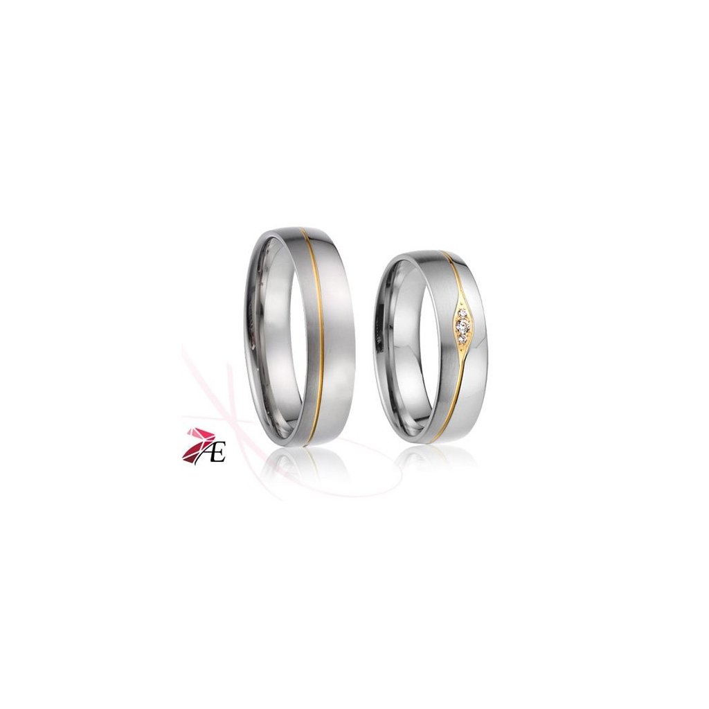 Precizně zpracovaný pár snubních prstenů. Povrchová úprava je v kombinaci sametového matu a vysokého lesku s jemným pozlaceným proužkem, který dává prstenům svou jedinečnost. Dámský prsten je zdoben třemi různě velkými vybroušenými zirkony, které jsou do prstenu ručně vsazovány. Šířka fazony u těchto prstenů je 6,00 mm. Dámské velikosti (s kameny) 49 - 64. Pánské velikosti (bez kamenů) 56 - 74.