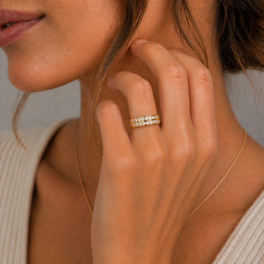 Zlatý prsten je vyroben ze žlutého zlata ryzosti 585/1000. Zlatý prsten je ve dvou řadách osazen bílými zirkony briliantového brusu. Šířka hlavy prstenu je 5,60 mm. Zlatý prsten je vhodný ke každodennímu nošení. Šperk je kvalitně vyroben v České republice. Doporučujeme.