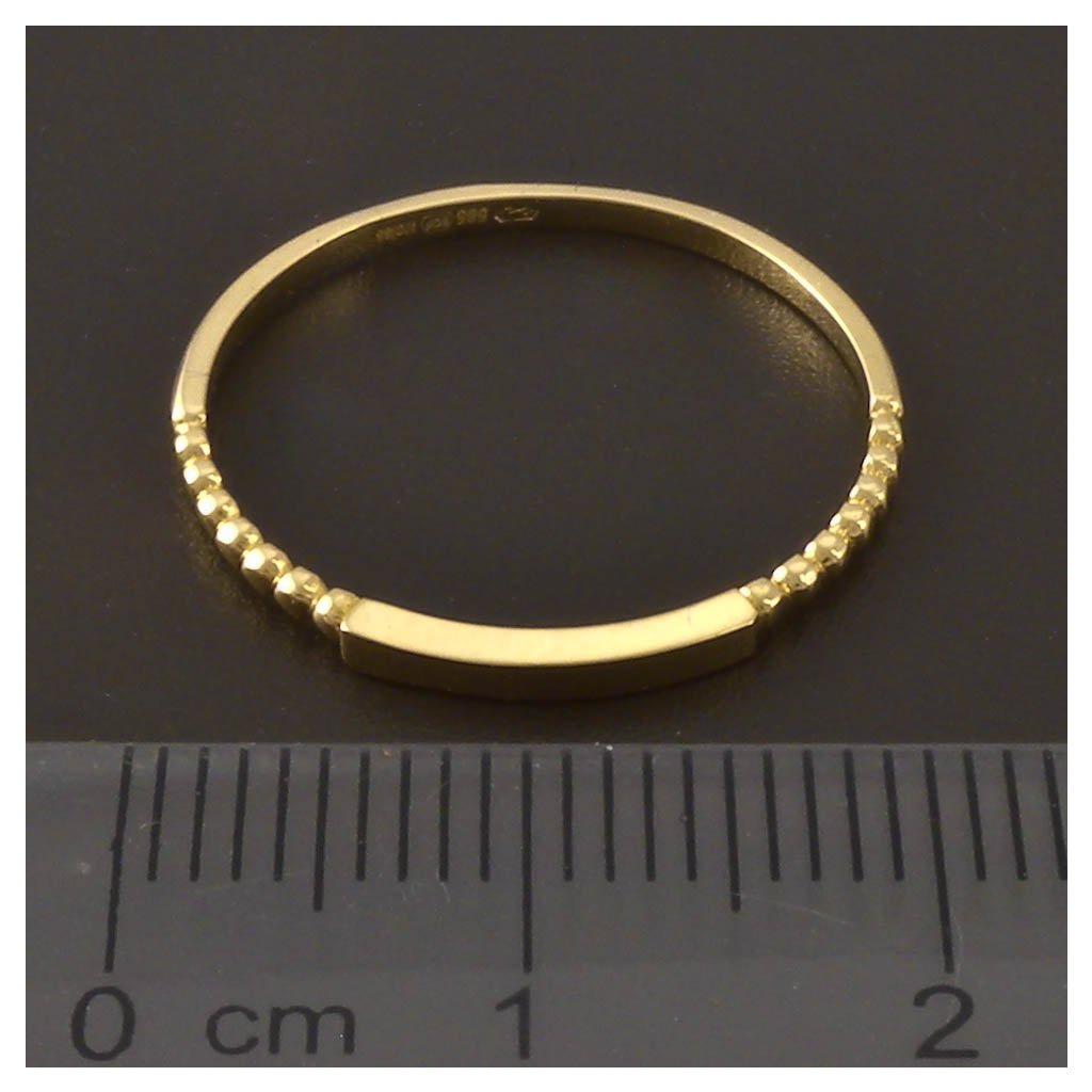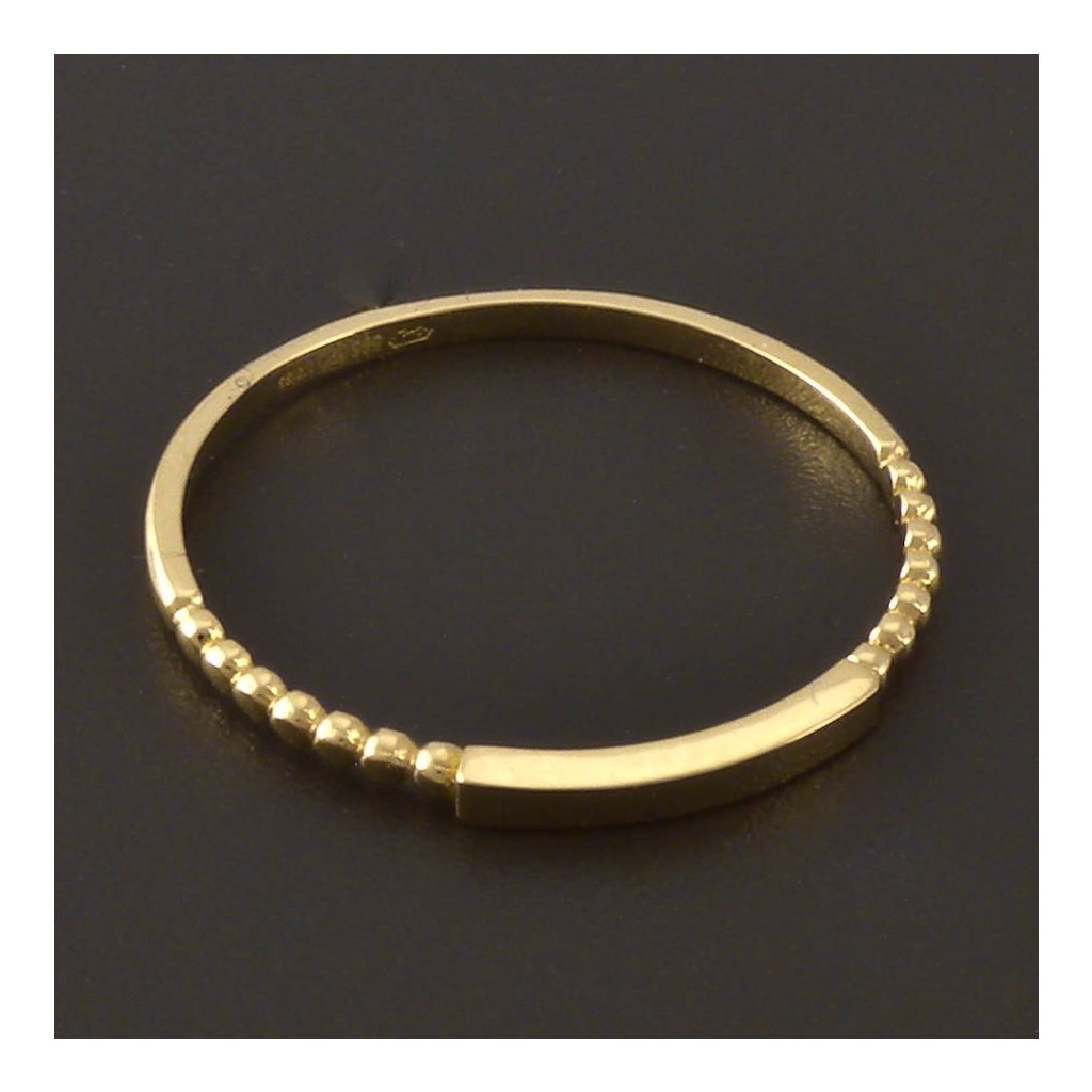 Zlatý prsten s jedinečným spojením dvou stylů – zatímco jedna polovina je zdobená drobnými kuličkami, druhá je dokonale hladká a lesklá. Tento kontrast dodává šperku moderní nádech a nadčasový vzhled. Díky jemnému provedení je prsten lehký, pohodlný a ideální jak pro samostatné nošení, tak pro kombinaci s dalšími prsteny. Tento prsten se stane elegantním doplňkem, který si oblíbíte na každý den.