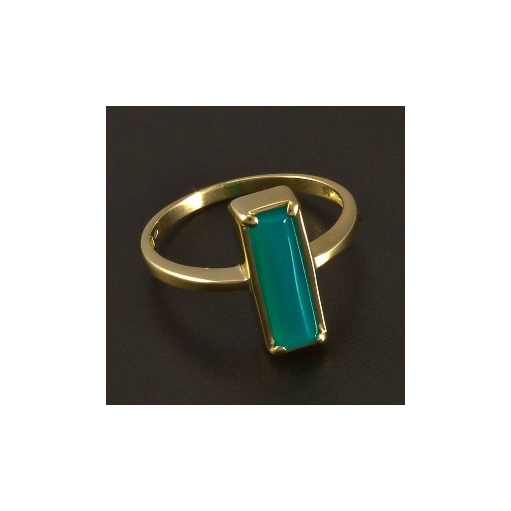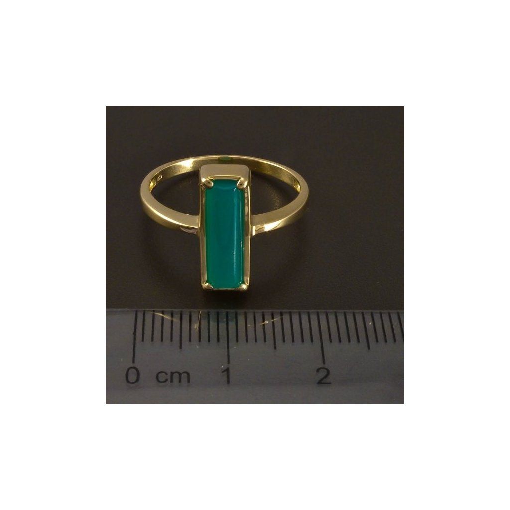 Prsten je vyroben ze žlutého zlata ryzosti 14kt 585/1000. Nádherný zlatý prsten je osazen zeleným chryzoprasem obdélníkového tvaru. Velikost kamene je 13x4 mm. Šířka hlavy prstenu v lesklém hladkém provedení je 15 mm. Elegantní nadčasový šperk vhodný pro každou příležitost.