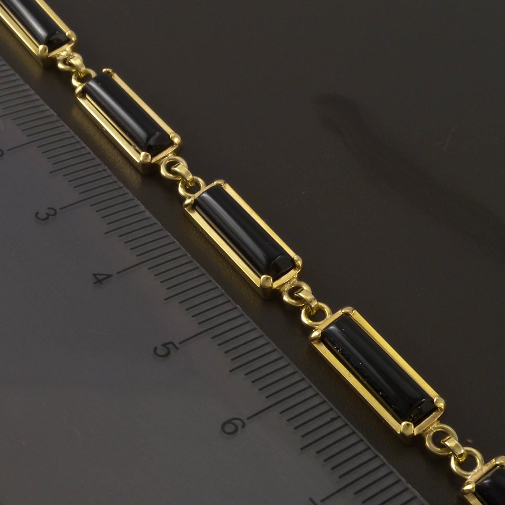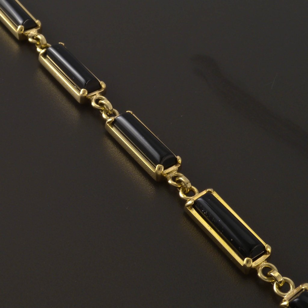 Černý onyx – kámen síly, ochrany a elegance – tvoří dominantní prvek tohoto luxusního zlatého náramku. Lesklé obdélníky z přírodního onyxu jsou vkusně zasazené do zlatých článků a společně vytvářejí harmonický a výrazný celek. Díky své syté černé barvě se onyx snadno kombinuje s ostatními šperky a oblečením, zatímco zlatý rám každého kamene dodává šperku noblesu. Náramek je pevným a nadčasovým doplňkem, který potěší i náročné zákaznice.