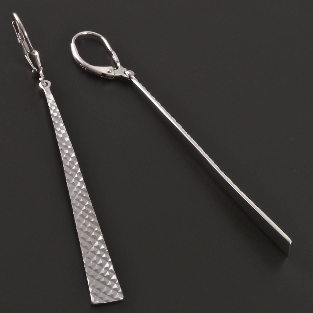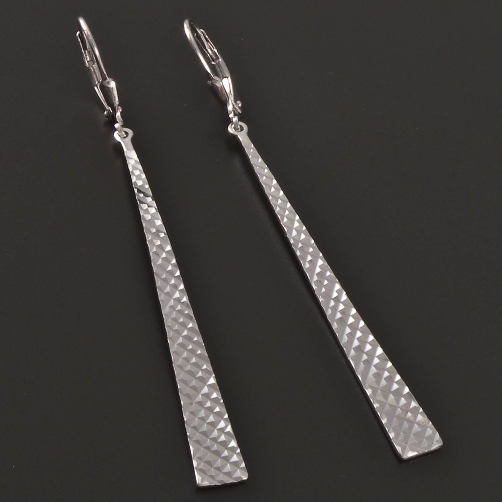 Nadčasové visací náušnice vyrobené ze stříbra 925/1000 zaujmou svým prodlouženým tvarem a geometricky vybrušovaným povrchem, který vytváří krásnou hru světla. Jejich minimalistický, ale efektní vzhled se hodí pro každou příležitost – od běžného dne po slavnostní večer. Náušnice jsou povrchově upraveny rhodiem pro dlouhodobý lesk a odolnost. Patentové zapínání zaručuje pohodlné a jisté nošení. Tyto náušnice představují dokonalou kombinaci elegance, lehkosti a stylu.
