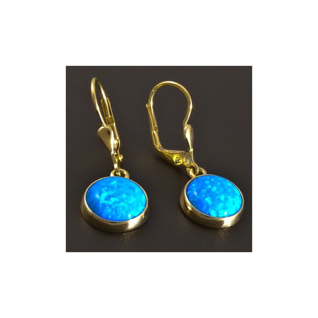 Visací náušnice jsou vyrobeny ze žlutého zlata ryzosti 14-kt. 585/1000. Lesklé náušnice ze žlutého zlata jsou v hladkém provedení a jsou osazeny modrým synt. opálem o průměru je 9,5 mm. Zlaté náušnice mají klasický dámský patentový uzávěr. Moderní náušnice ze žlutého zlata jsou vhodné pro každou příležitost. Zlatý šperk je precizně vyroben v České republice - doporučujeme.