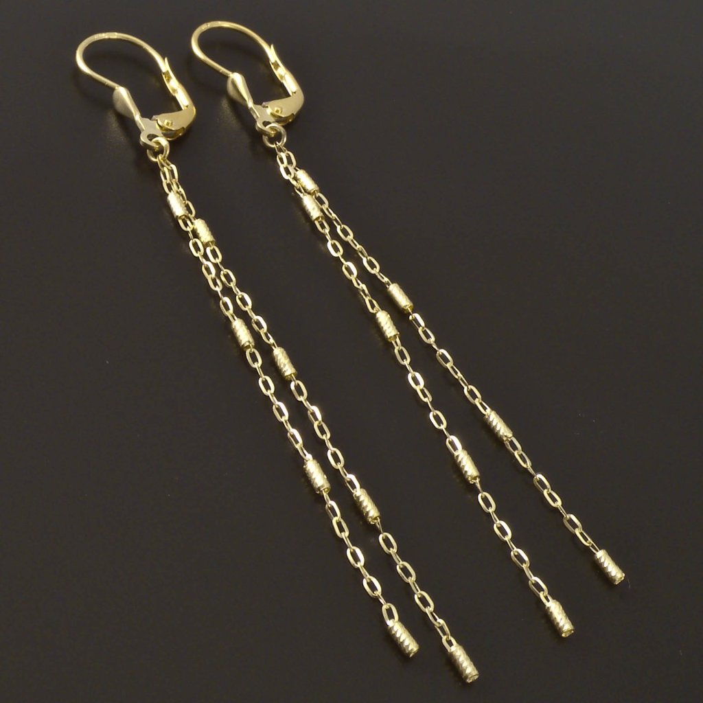 Dodejte svému vzhledu lehkost a pohyb. Tyto elegantní visací náušnice ze žlutého zlata zaujmou dvojitým řetízkem s jemným zdobením, které se při každém kroku přirozeně hýbe a odráží světlo. Efektní, ale přesto decentní šperk, který skvěle doplní jak elegantní šaty, tak jednoduchý denní outfit. Náušnice jsou lehké, takže nezatěžují ušní lalůček, a bezpečné zapínání na patent zajistí pohodlné nošení. Pokud hledáte dárek, který potěší každou ženu s citem pro jemné šperky, jsou tyto náušnice skvělou volbou.